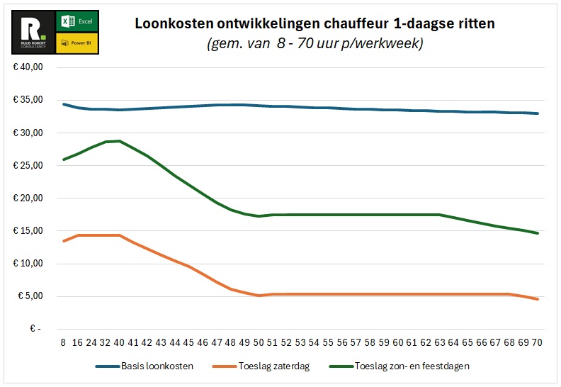 Onderstaande grafiek laat de loonkosten zien van een chauffeur van een gemiddeld transportbedrijf met een gemiddelde werkweek van tussen de 8 t/m 70 uur.